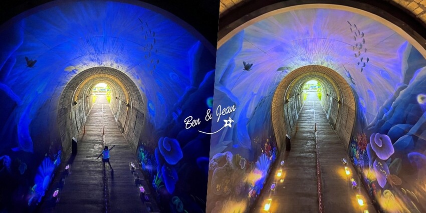 隧道內最受矚目的3D海洋彩繪牆, 每天上午9點到晚上9點,每隔30分鐘會有10分鐘的定時燈光投射,讓人彷彿置身奇幻的海洋世界之中!! 只有短短的70公尺左右,是個可愛的小景點