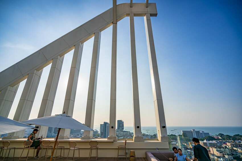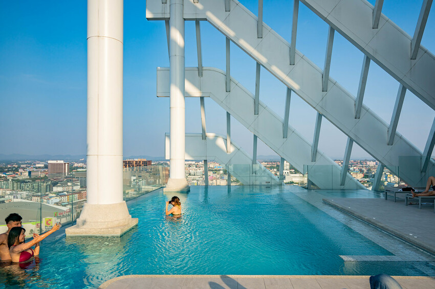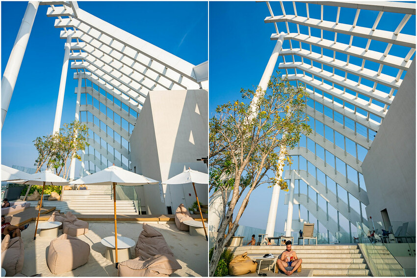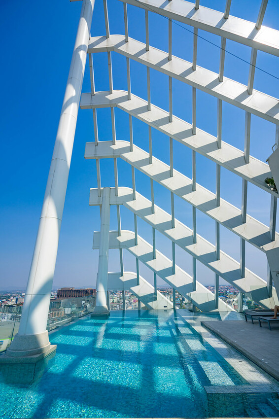泳池位於最高的24樓,面積不大,但超美,由於是無邊際,游泳時就感覺悠遊在雲端一樣,而且視野超好,可以俯瞰一大片 Pattaya 美景,旁邊有海灘椅,躺在海灘椅做日光浴超享受,就算只是發呆也很舒服,而純白簍空的造型設計,讓泳池變身成大型攝影棚,不管順光逆光都可以拍出封面等級的照片,只怕手機或相機的記憶容量不夠拍,來之前記得先把容量給清出來啊!