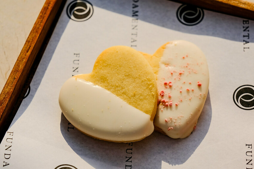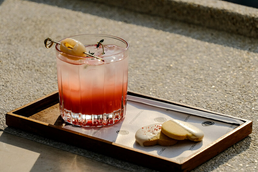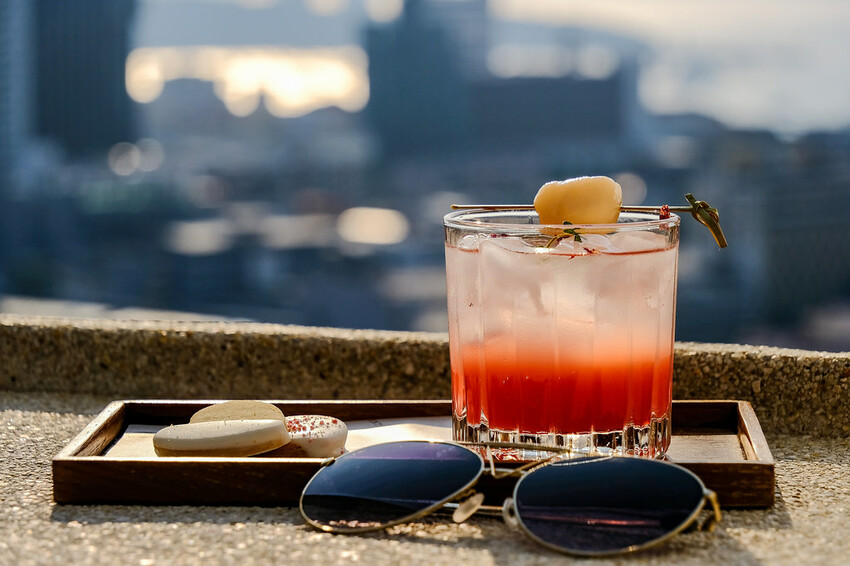 在等待日落時,去點了一杯調酒來拍照,這杯叫做 Rose Confess,粉紅色的酒體,喝起來酸酸甜甜,沒有酒感,適合不常喝酒的女生喝,還附上二片心型的餅乾,不得不說在夕陽下拍出來還挺好看的。