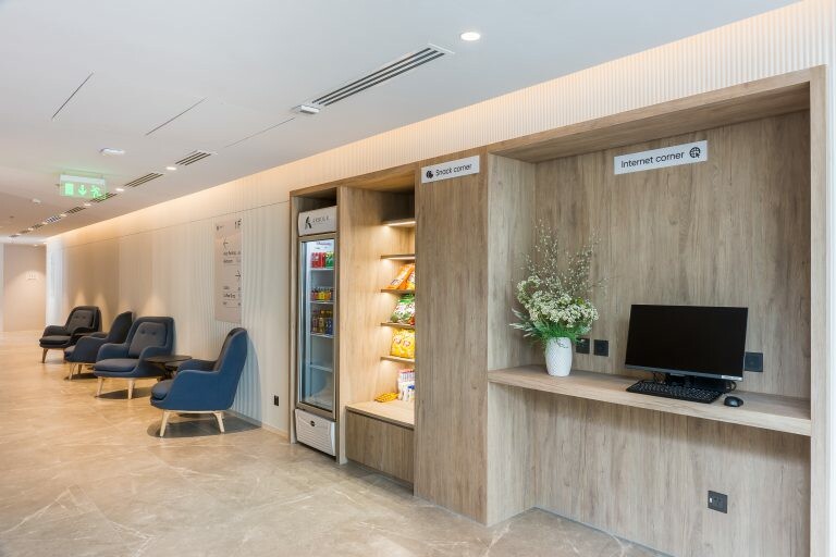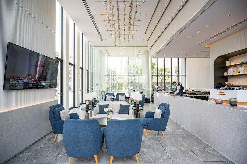 一進門是挑高的接待大廳,純白色系的設計簡約又時尚,周圍都是大片落地窗,看著灑落的陽光令人心情愉悅。櫃檯服務人員專業又親切,向我要了資料後就請我到咖啡吧前休息等候,我就趁機拿著相機到處拍拍啦!
