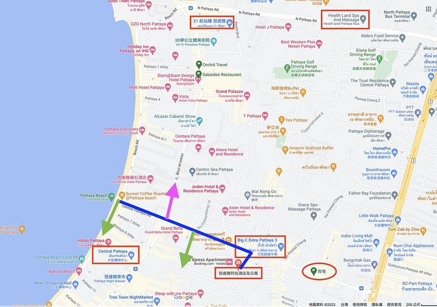 酒店附近的生活機能還不錯,有餐廳、小吃,Big C Extra、HarborLand等購物商場及7-11,Central Pattaya Rd 上有很多泰式按摩店,價格都很便宜,但看不透玻璃的不要隨便進去喔!距離Pattaya 海灘也只有1.2公里,出入可以步行、搭摩托計程車、app叫車(推薦bolt)、搭雙條。