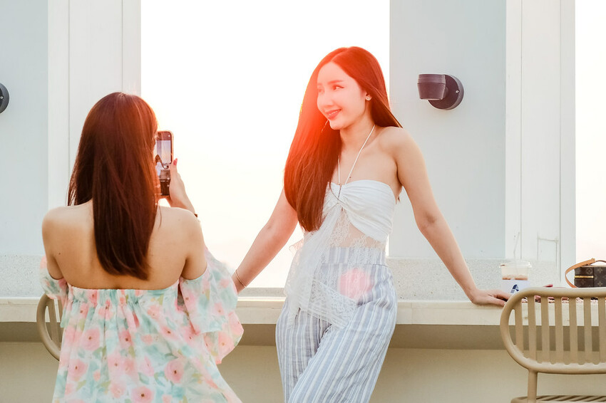 接待櫃檯前的等候休息區,有幾位旅客剛從頂樓下來,正在邊休息邊檢視剛剛拍的美照。