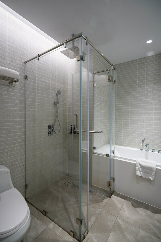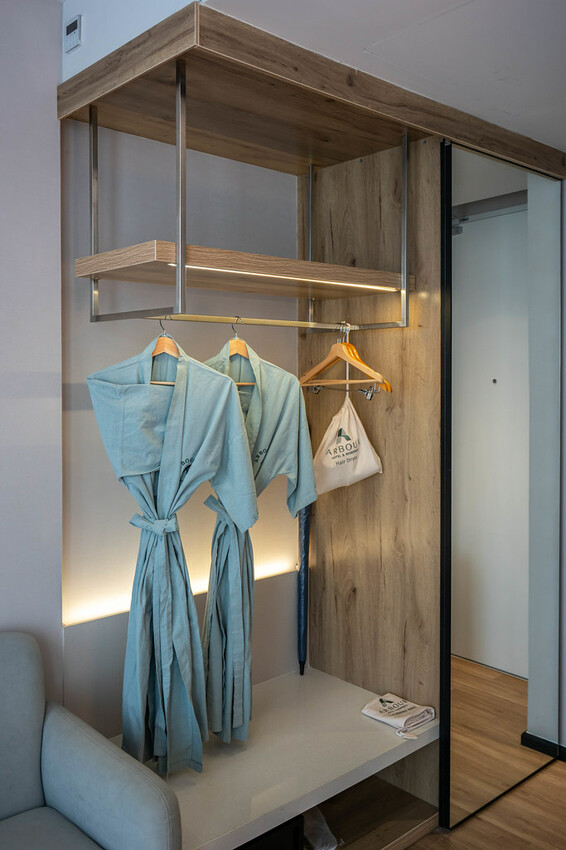 浴袍、保險櫃、冰箱、洗衣機、熱水壺(咖啡、茶包)、微波爐、電磁爐、吹風機、每日2瓶水等都有提供,還有一大片穿衣鏡可當作開放式衣櫃的拉門。