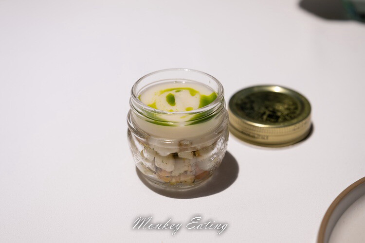 淡菜沙拉用小玻璃罐裝,顯得小巧可愛,醬汁口感鮮甜,裡面有許多料,要吃之前可以拌一下