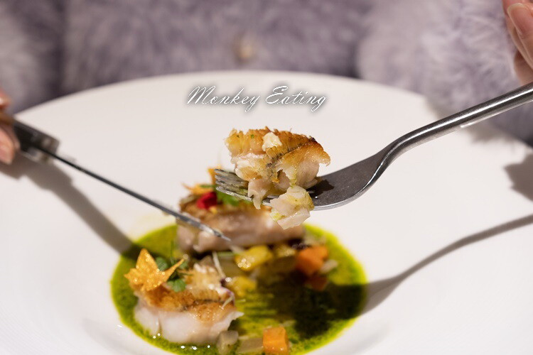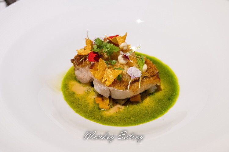 酥脆魚鱗跟鮮嫩魚肉呈強烈對比,營造出不同的口感衝擊,魚肉整體相當細緻鮮美,當然整道的擺盤呈現也讓人享受。