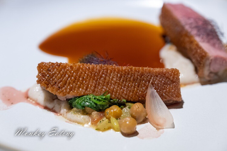 自家14天熟成的鴨胸,外皮煎到焦脆看起來格外可口,搭配的是菱角泥、鷹嘴豆、過貓、洋甘菊醬汁