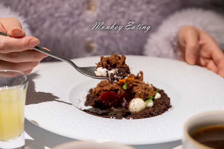 由巧克力碎片,鮮奶油,酒釀櫻桃組成,結合了分子料理藝術,怎麼混合搭配都有不一樣風味的呈現,這甜點相當喜歡。