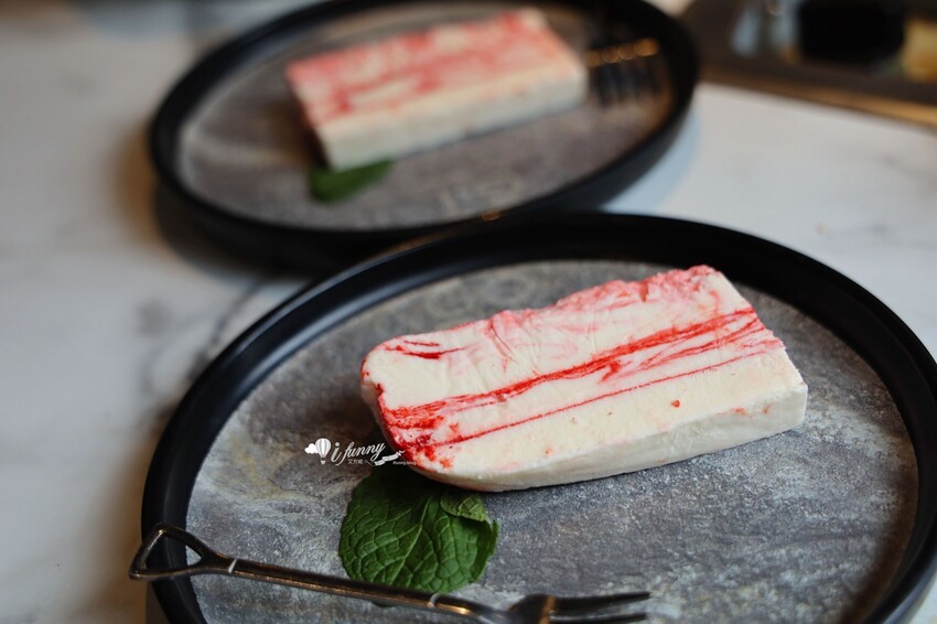 這個仿豬五花的甜點,實在太令人驚豔了!是冰凍的生起司蛋糕,不會太甜膩。