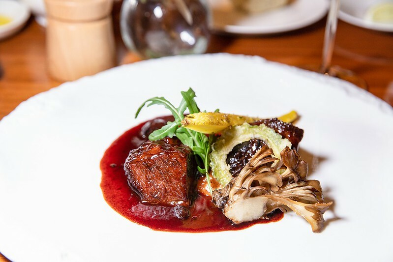 主餐是沖繩銘柄豬「阿古豬」,加2100日幣可以換成牛臉頰肉,本來到沖繩應該點阿古豬,但這陣子實在吃太多豬,很想換換口味,又聽說這道是夏威夷母飯店「HALEKULANI」著名的餐點,更應後廳嚐嚐。味道上近似紅酒燉牛肉,酸甜飄著淡淡的酒香,還有一點點像是水果香的清爽,牛臉頰肉軟綿帶著像是膠質的化口感,好吃得亂七八糟,一旁的配料除了舞菇外,刻意配上沖絞的名物苦瓜,盤底的馬玲薯泥更是細滑綿密到不行。