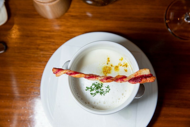 本日濃湯是白花椰菜卡布奇諾濃湯,淋上一點補足油氣的醬汁和脆到不行的餅乾,暖心暖胃好一會兒,不想再吃任何食物,以免沖刷了那白花椰濃湯迷人的味道。