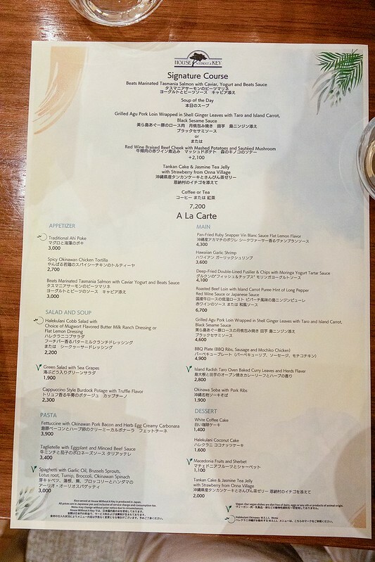 我們在這的三晚,晚餐分別享用了前面介紹過的「Innovative SHIROUX」(日法餐)、「AOMI青碧蒼」(日料),本來最後一晚想訂同樣在飯店的牛排館「Kingdom」可惜訂位已滿,於是來到前一天已經在這吃過午餐的「House Without A Key」。這裡的午餐以單點為主,晚上則是套餐的方式供應。先來看看晚上每位7200日幣的四道料理的套餐。