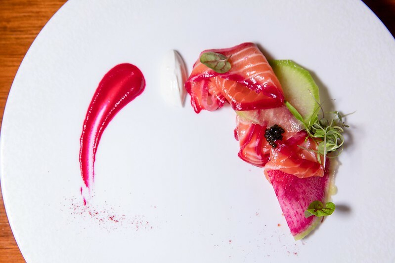 第一道是鮭魚生魚片的法式前餐,比較特別的是以莓果和優格調出的醬汁,清爽微酸,搭配偏日式的生菜,簡單灑了一點點岩鹽和魚子醬調味。