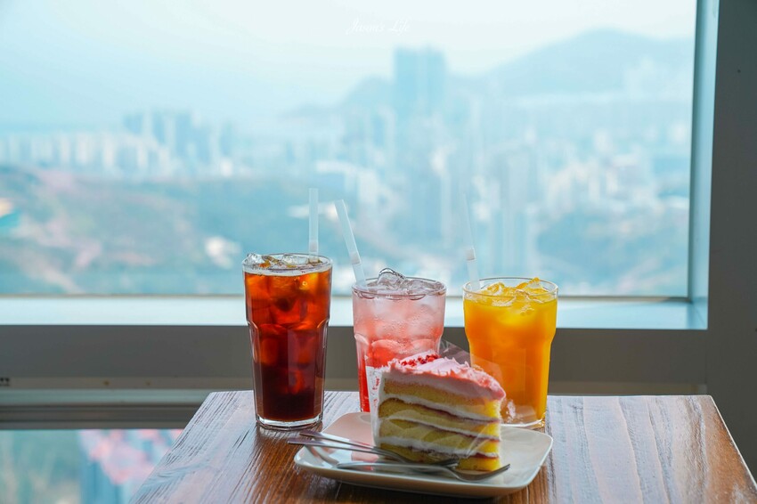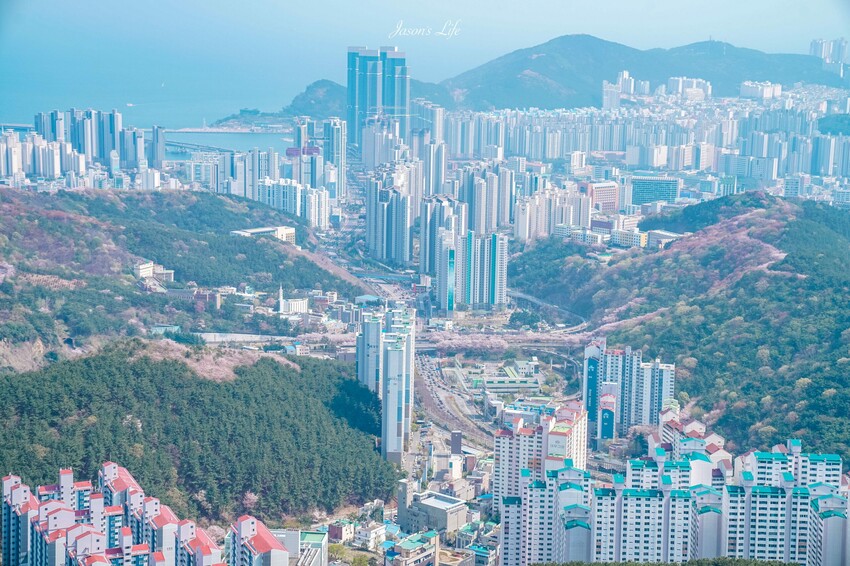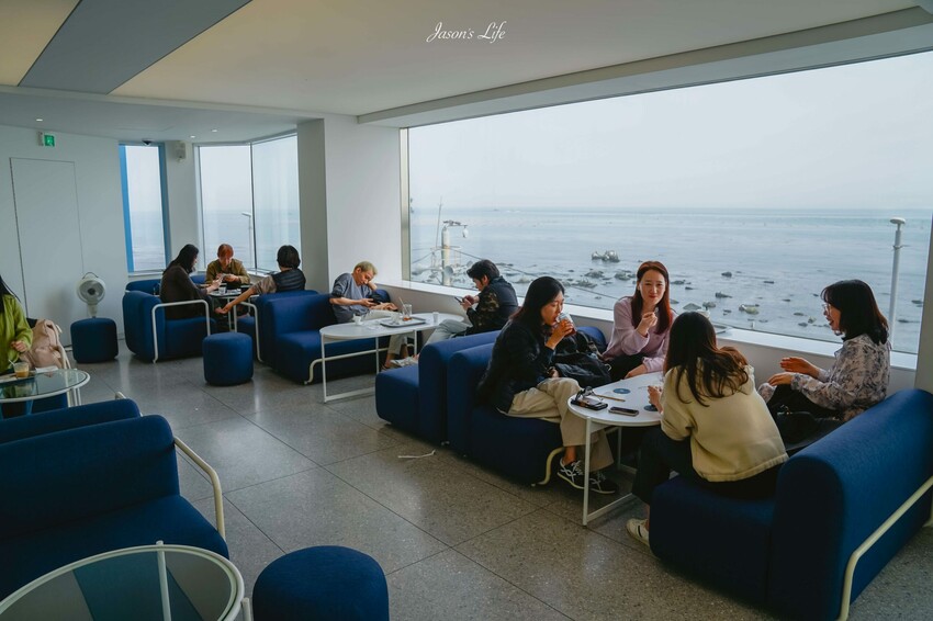 這裡有間咖啡廳,一旁的落地窗可以看到釜山市景
