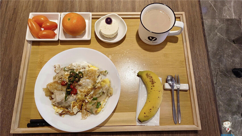 當天的早餐是炒蛋餅,外加一杯豆漿和小蛋糕及水果