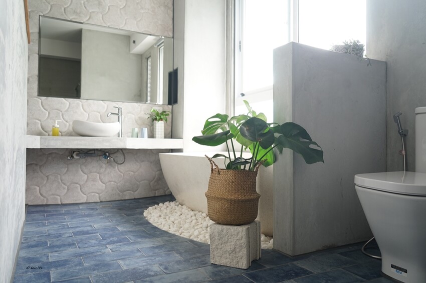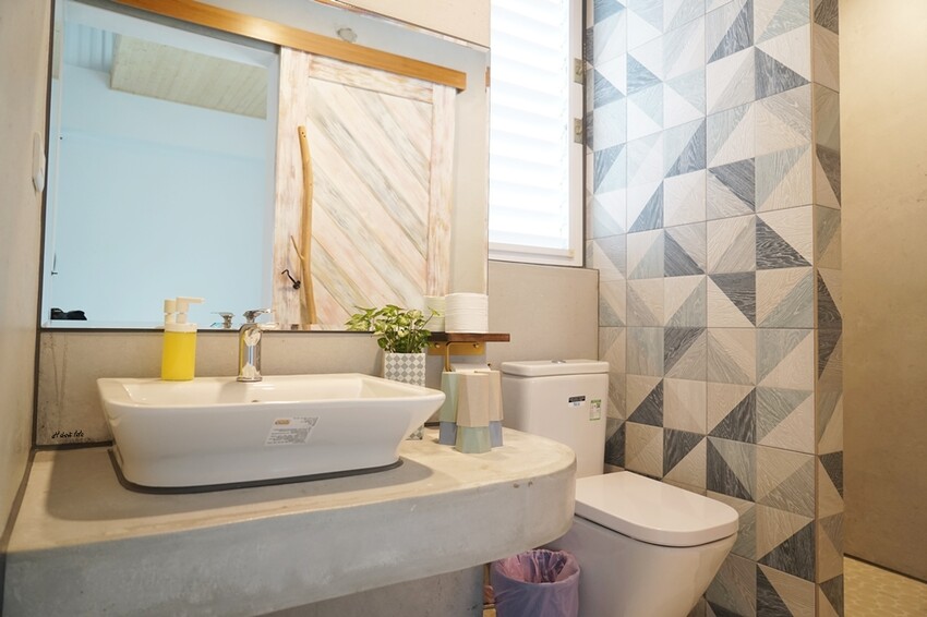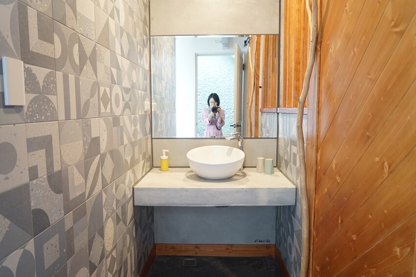 浴室那個牆面也太美~~~~ 據說拉拉可是中部第一間敢用這塊磚的人,這磚造價昂貴,但非常有質感,搭配浴室水藍的義大利復古磚非常好看。