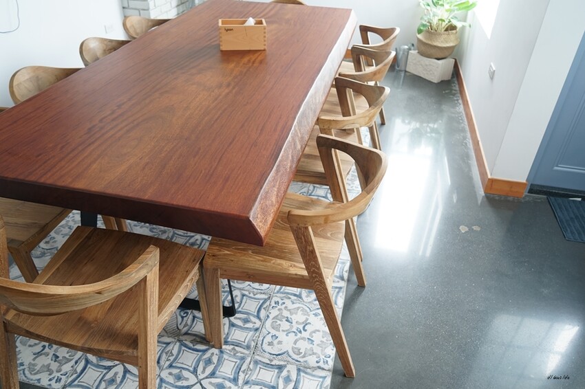 我好喜歡柚木桌椅下方的進口復古磚,略帶斑駁而高雅的色彩與圖樣,讓它像地毯一樣落在桌面下,卻又雅緻的讓人移不開目光。