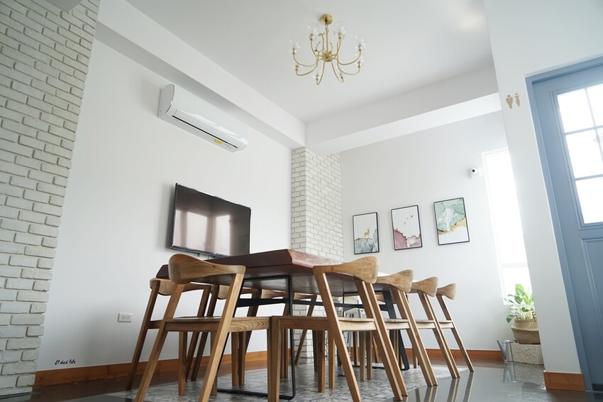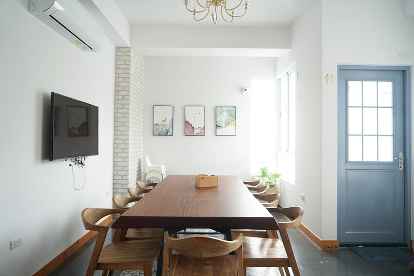 一樓的大廳很乾淨清爽,整塊無拼接的柚木實木桌與設計感老柚木椅,給人一種厚實安定而溫暖的感覺。