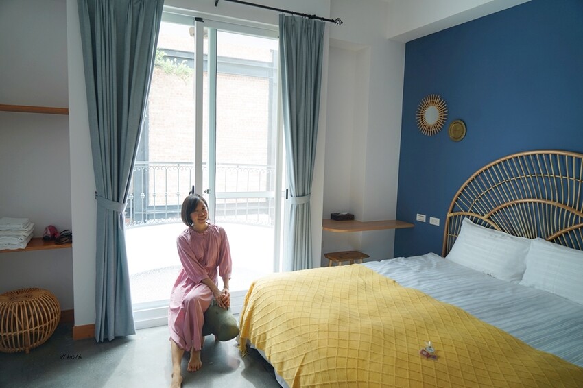 205雙人房的配色相當大膽好看,這藍色牆面搭配藤編的床頭板好有味道。