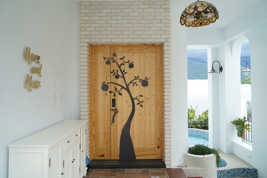 為了保持室內的整潔乾淨,進入超令人推薦的南投包棟民宿-希爾拉villa前要更換室內拖鞋。我也超喜歡這蘋果樹的大門,很有童話故事的風格。仔細看會發現,大門的把手還是個樹苗的樣子呢!