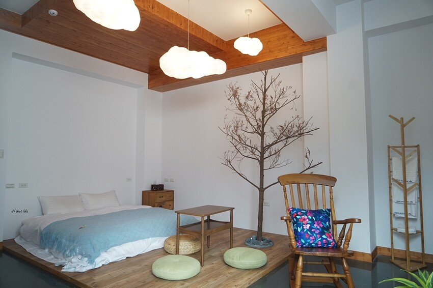 一樓唯一一間房間是101雙人房,這是整棟唯二兩間有浴缸的房型。超夢幻的雲朵燈搭配漂亮的大樹,好睡的獨立筒床墊直接放在木地板上,這樣的房型連小小孩也適合,不用擔心滾下床。