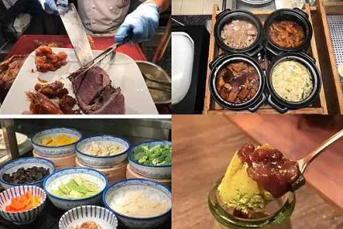 明宮粵菜廳裝潢古色古香,充滿人文藝術氣質美感,就像來到博物館裡用餐相當精緻優雅,一入座會附上自選的熱茶,非常暖心。這次來明宮粵菜廳有點可惜是我居然忘記提前預訂媽媽愛吃的烤鴨,最後選擇四人組合套餐,內有「港式燒味三拼、糖醋咕老肉、滑蛋蝦仁、豆醬蒸鱈魚、清炒時蔬、芝麻球、蘿蔔糕、例湯、甜品、水果」。