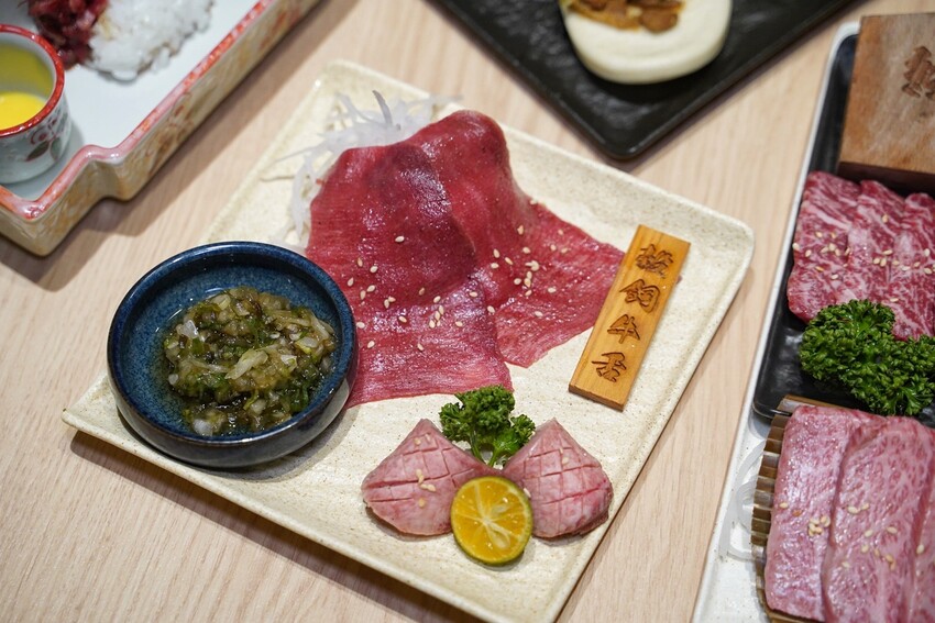 「穀飼牛舌」一次提供薄切的舌尖部位以及厚切的舌中後段部位,薄切口感較脆口,厚切則吃起來Q彈多汁,一次滿足兩種口感。
