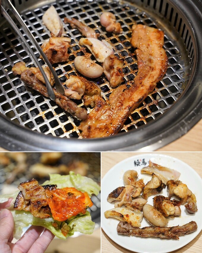 「美國prime牛小排」帶有一定的彈性與結實度,整體來說也是軟嫩的。厚切「橫隔膜」很有誠意,肉片形狀修的很端正,肉色最深、肉味明顯,建議稍微烤至焦脆更好吃,很適合包生菜、蔥鹽一起享用。