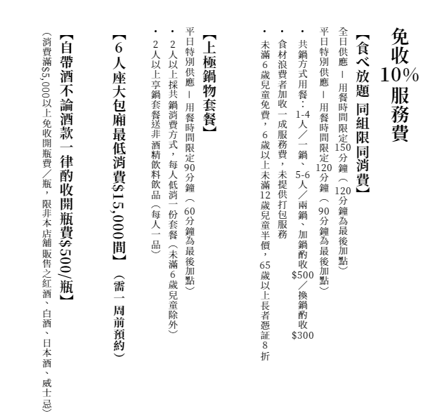 包廂需要一周前預定,低消$15000,且會提供桌邊服務
