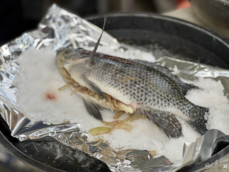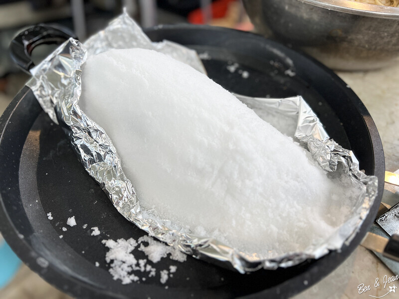 「輕親魚朵生態園區」將魚處理後再用大量鹽吧封起來就可以進爐烘烤了