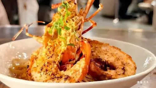 主食則點了這道濃情羅勒天使蝦麵,上面放了兩支跟手一樣大的巨無霸天使紅蝦,並使用自製蝦醬進行調味,中段去殼的天使蝦美味鮮甜,配上混和蝦醬與羅勒的麵一起吃,濃郁鮮美的味覺風華,不停地在舌尖迴盪,不過麵條偏扎實口感,非義大利麵的細軟Q彈,較不符合傑森大大喜歡的口味。