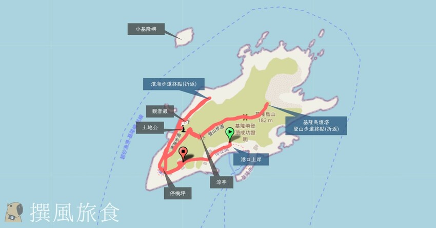 基隆嶼有登山步道與濱海步道兩條路線,兩條路線都必須折返,無法連貫環島,不過基隆嶼制高點不過182公尺,登山步道約730公尺、濱海步道僅460公尺,所以整體走完用時並不長。撰風當日的路線參考「基隆嶼港口登島→停機坪→基隆嶼登山步道→基隆島燈塔→折返→停機坪→基隆嶼濱海步道→折返→基隆嶼港口登島」,用時約1小時36分鐘,時間主要用在拍照。