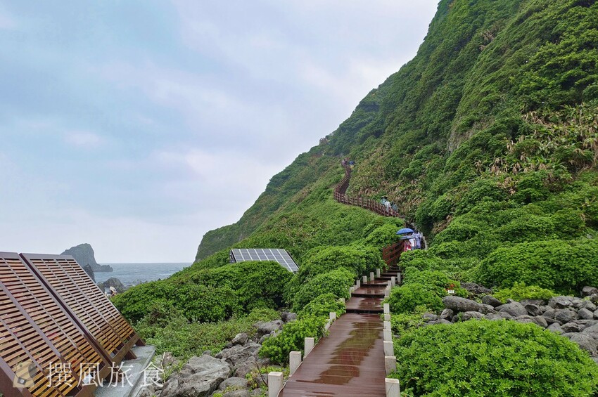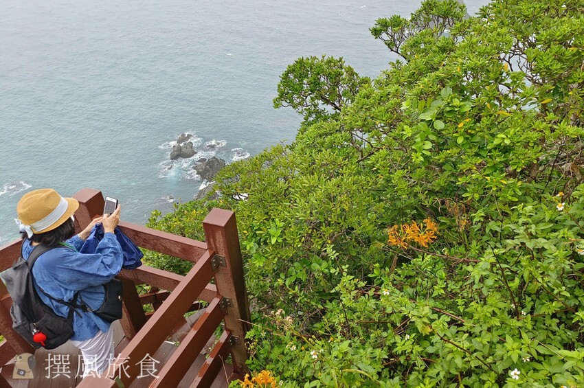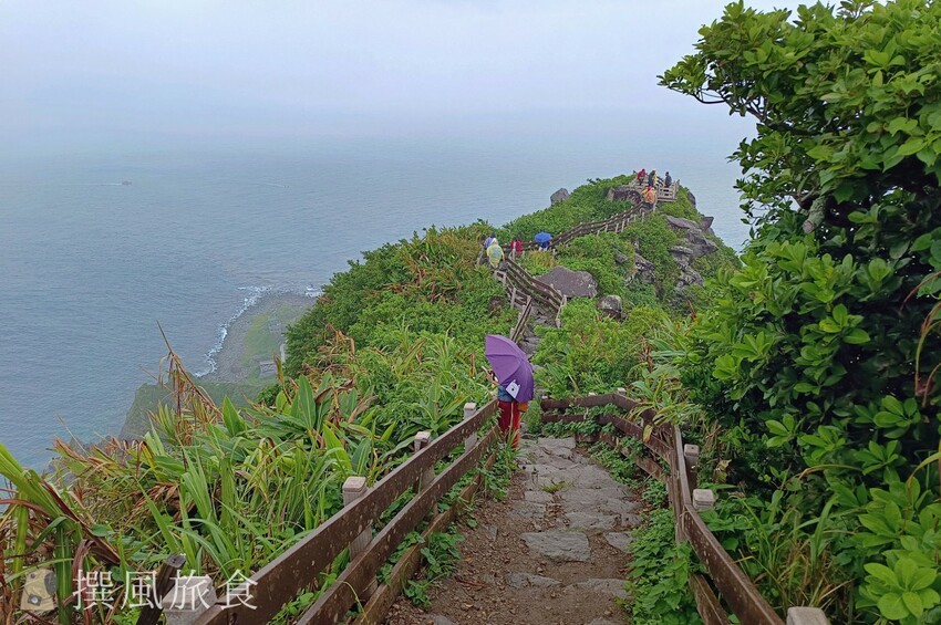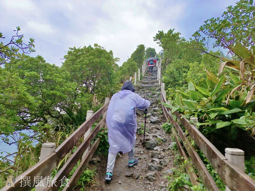 基隆嶼步道有登山步道與濱海步道,導遊說如果體力不太行可以選擇濱海步道走走就好,不過撰風認為如果只是平時缺乏運動的情況,要克服基隆嶼登山步道其實也不算太困難的,整體體力消耗並不大,欄杆修葺情況也算良好,只是步道較窄,所以若有速度較慢的「班長」,可能會導致步道堵塞。