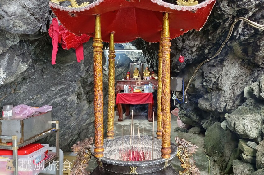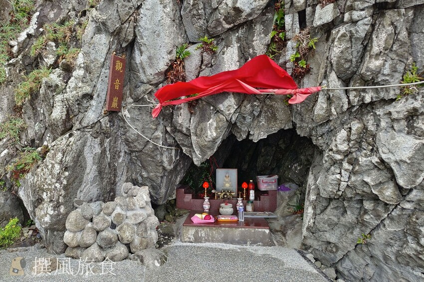 基隆嶼登山步道返回步道口,可再繼續走濱海步道,濱海步道路線極短,僅458公尺,大概10分鐘就走完了,沿途有土地公廟與觀音巖,濱海步道底可遠望小基隆嶼,小基隆嶼與基隆嶼形狀看起來就是相似形狀縮小版,相當可愛。