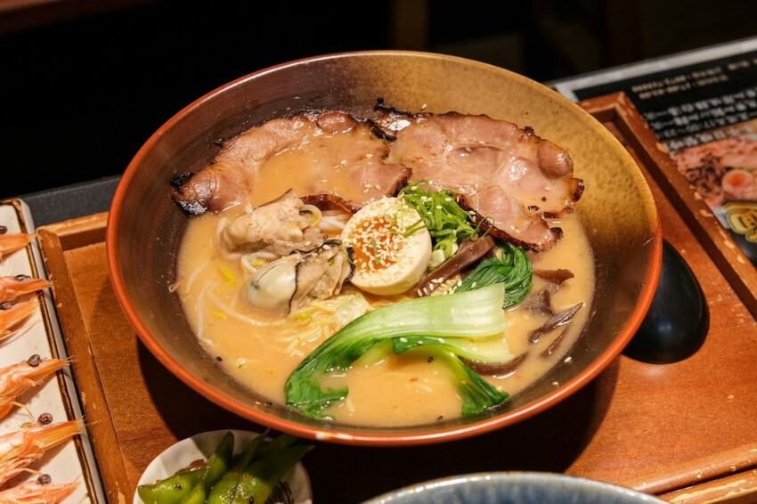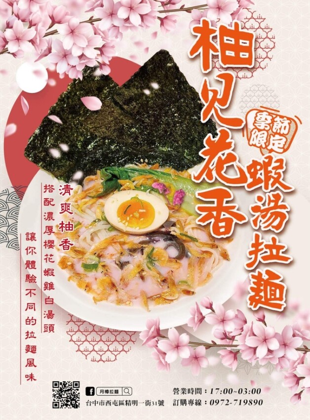 【月樽拉麵】以正宗日式拉麵與泡飯為主打,供應雞白湯和辣味噌雞白湯,搭配戰斧、廣島牡蠣、櫻花蝦、蛤蠣、鮭魚等,不定期推出季節限定的口味,無論海陸食材通通都吃得到,還有小菜和飲品可以點選,餐點品項豐富且齊全。