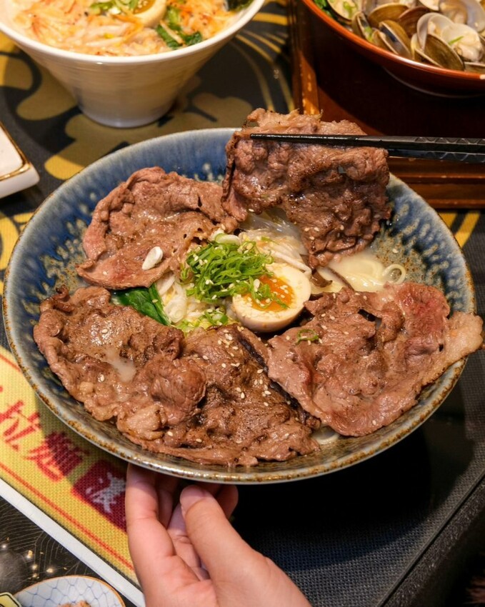 ▼如同花朵綻放的炙牛肉魂叉燒拉麵,將厚度十足的牛肉以大火炙燒,逼出滿滿的油質及香氣,融入清澈甘甜的雞白湯頭中,沒有過多調味,喝得到明顯的雞脂香氣,嫩軟好咬的牛肉,在嘴裡散發出迷人火燒香氣每一口都有著驚喜的風味變化。