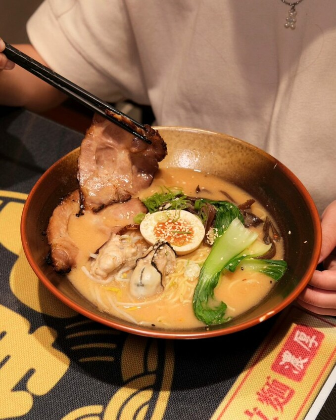 ▼再霸氣給上兩大顆生食級的廣島牡蠣,肥嫩多汁超過癮,還有搭配以火烤炙燒的豚肉,溏心蛋、木耳絲和青菜等(配料隨季節不定期調整),吃完整碗絕對很有飽足感 !