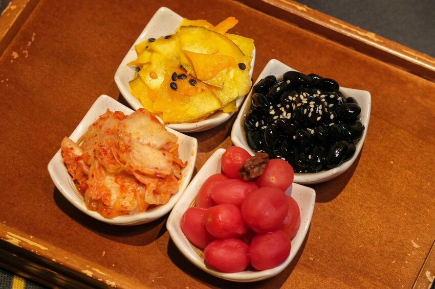 ▼想要換換口味也可以來點手工小菜,以脆口南瓜製作的百香脆瓜,酸酸甜甜相當開胃,梅漬蕃茄咬下則會在嘴裡噴汁,既清爽又有解膩效果~