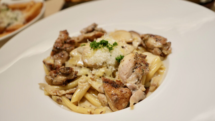 這是這一季的新品,在蝸牛可以吃到道地的義大利麵條,像這款扭扭麵就很特別,比一般的麵條更有嚼勁,每一條麵都吸附醬汁,每一口都是濃郁的松露奶香,上面還撲滿鮮嫩可口的烤雞腿,外皮竟還有點焦脆口感,雞腿肉非常軟嫩,大推。