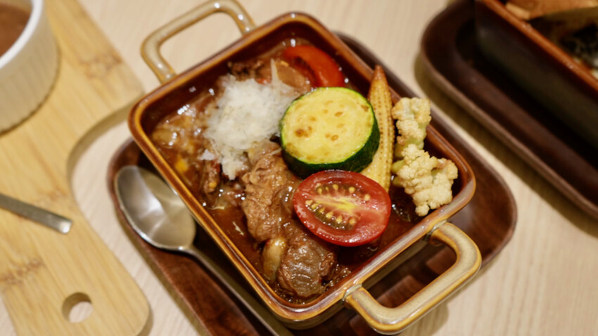 燉煮後的牛筋又嫩又Q彈,在餐盤的襯托下更顯晶瑩透亮,滿滿膠原蛋白爽滑軟嫩、入口即化,搭配辣味蔬菜,吃起來辣中帶牛脂香氣,讓牛筋美味升級。