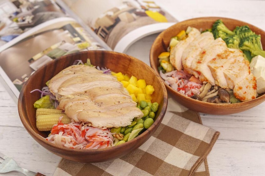 推薦這道泰式酸辣舒肥雞胸,酸酸辣辣的口感超級開胃!核桃木冷燻舒肥雞胸則是使用冷燻手法將核桃木的自然香氣及肉汁鎖在雞胸肉裡,吃起來軟嫩順口~