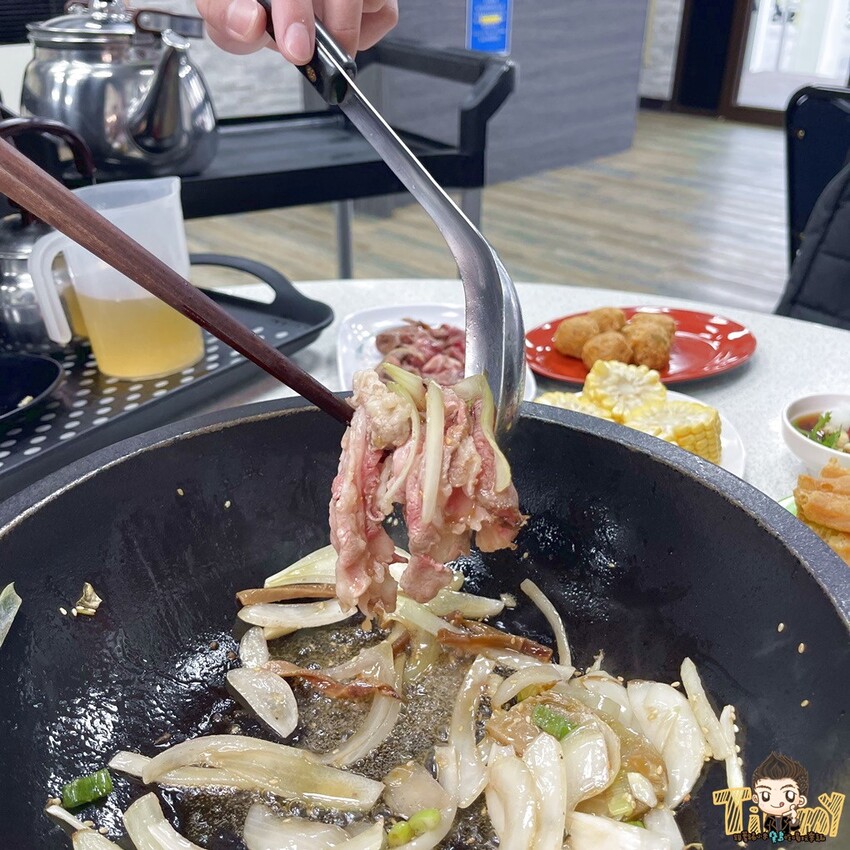 石頭火鍋特色是將乾魷魚、洋蔥、蒜頭等食材經過大火爆香,放入肉片拌炒後,再加入甜美的湯頭一起熬煮~