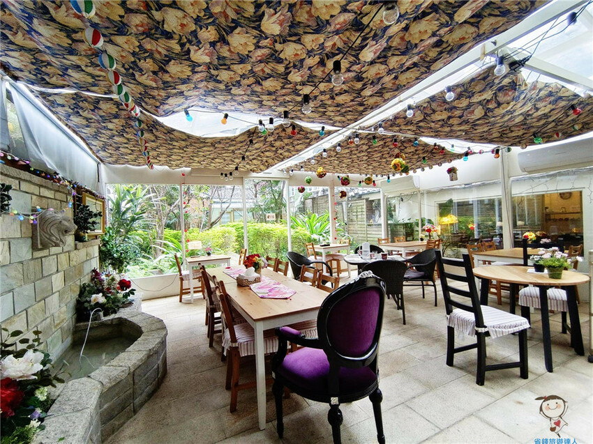 精心布置的花園玻璃屋,採光良好,玻璃天花板還有布幔遮陽和小燈泡裝飾