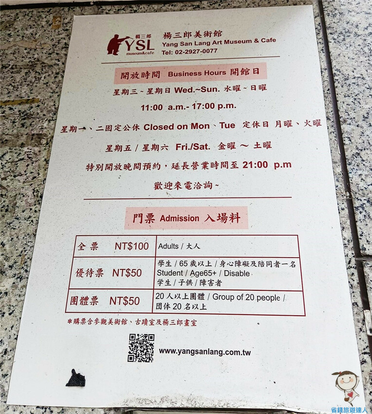 美術館門口有開放時間和門票的價格資訊