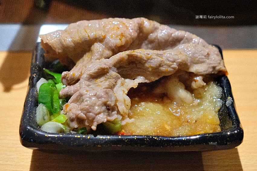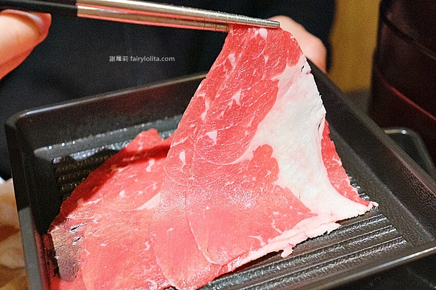 來源一樣是美國及澳洲,相較於雪花牛,它的油花就比較少一些,不過霜降真的很多客人喜歡,聽服務人員說也是相當受顧客喜愛,雖然油脂感沒有雪花牛那麼多,但它的甜度卻更高,我喜歡沾著佐醬一起吃的感覺,大片厚實又過癮。