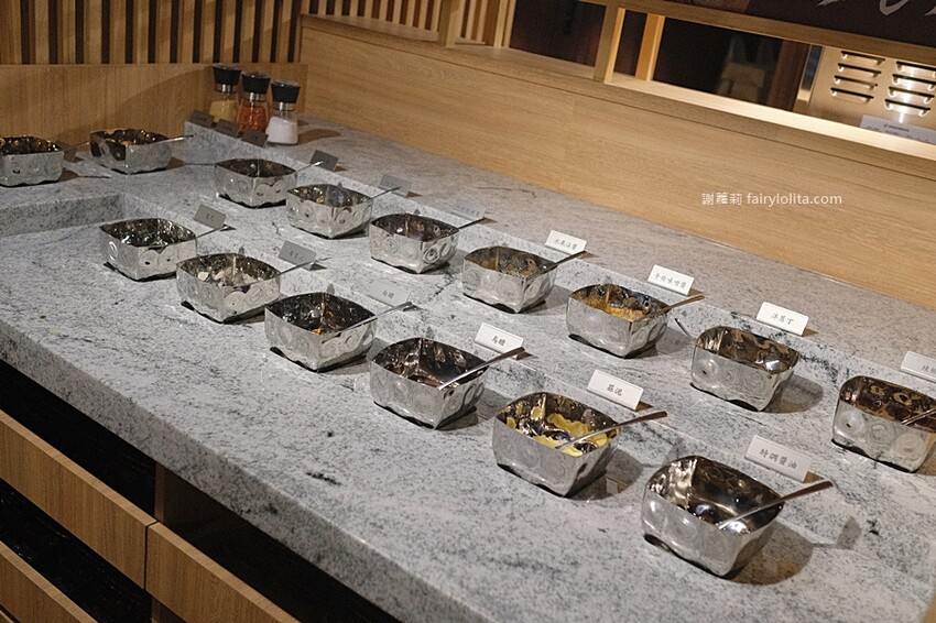 佐醬的部份也很用心,光是沾醬種類就足足有15種,別說常見的醬油、辣椒、大蒜、蔥、蘿蔔泥之外,這裡更多了其它店家看不見的醬汁,有興趣的朋友不妨可以試試看。