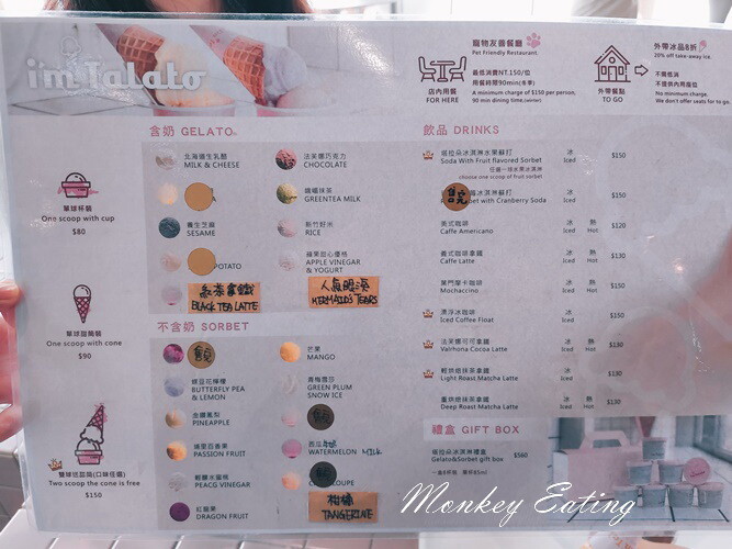 冰淇淋可選擇甜筒或杯裝,2球還另外贈送甜筒,另外飲品有咖啡系列跟氣泡飲可以選擇,內用每個人低消是$150,免服務費