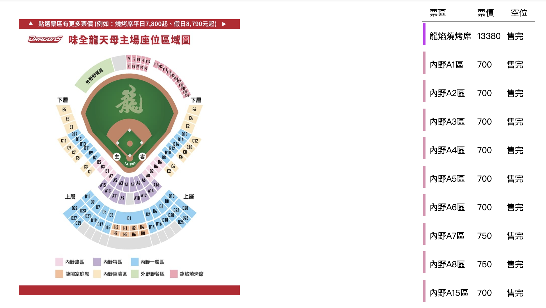 天母棒球場味全龍 龍焰燒烤席票價預訂