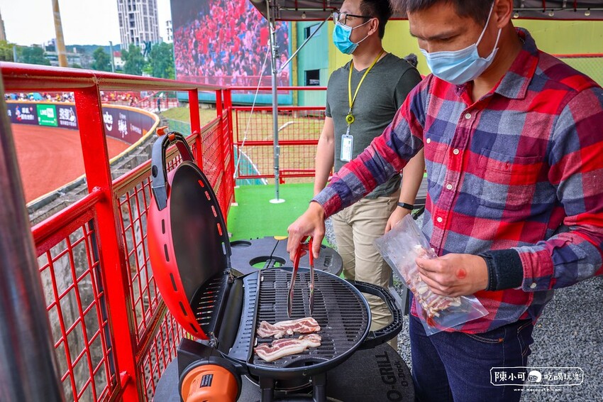 準備開烤前,會有味全龍工作人員來關心並指導O-Grill烤爐使用,這個烤肉神器可以悶烤讓食物變熟,這樣就可以專心看球賽啦!