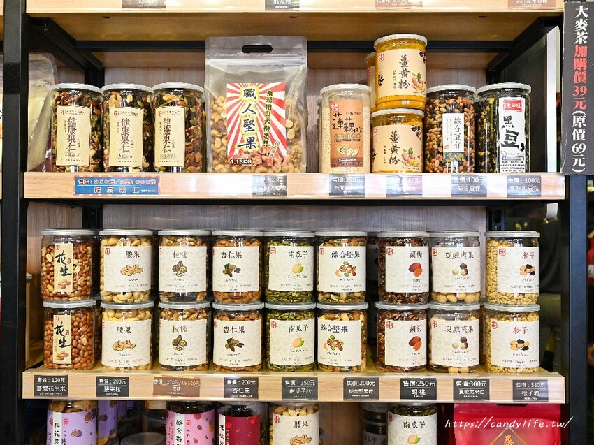 這邊是堅果區,有腰果、核桃、杏仁果、南瓜子、胡桃、夏威夷果、松子、花生、黑豆及綜合堅果,有罐裝也有隨身包