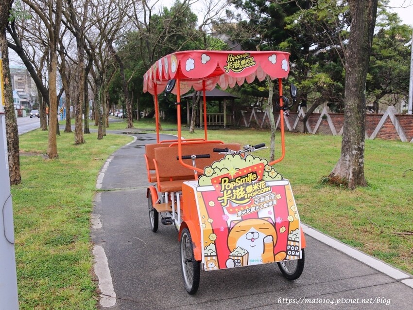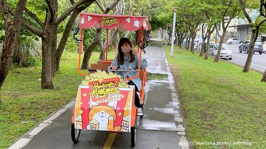 第三站:八里左岸租車推薦|田園小站~卡滋爆米花X白爛貓專屬電動車,悠閒暢遊八里左岸景點,模樣吸睛、輕鬆欣賞沿岸風光